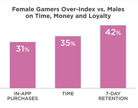 据权威数据表明,女性花更多的时间和金钱在移动游戏上,对于游戏的忠诚度也高于男性。根据统计可得出: