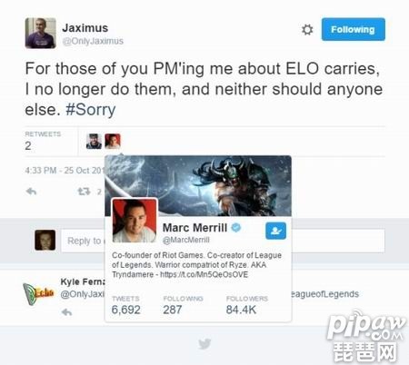 近年来,LOL代练的问题一直得不到解决,国内甚至还有LOL代练工作室,不过从去年11月开始,拳头就开始在代练LOL的问题上采取措施,一旦被查到代练就永久性封号。然而最近几天,外媒Esportsheaven爆出猛料,称拳头创始人之一Marc Tryndamere居然在2012年涉嫌代练。