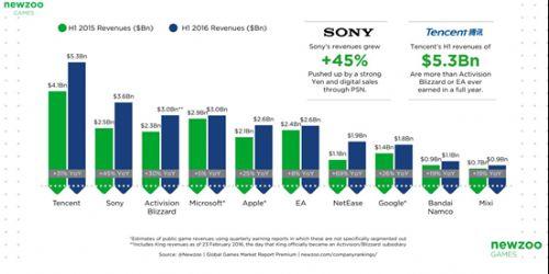 腾讯在这份报告中排第一位,它是全球营收最高的上市游戏公司,上半年营收53亿美元。由于先后收购了Riot和Supercell(前者拥有《英雄联盟》,后者则拥有《海岛奇兵》、《部落冲突》等知名游戏),让上半年只有41亿美元营收的腾讯直线增加至53亿美元。在腾讯完成对Supercell的收购后,二者几年合计营收将达到130亿美元。