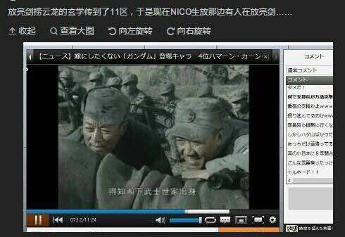 上面是在日本弹幕网站 NICONICO播放的电视剧《亮剑》,这部抗日剧曾经在日本人气爆棚。原因是,主角李云龙与日本著名页游《舰队Collection》的稀有角色 云龙(原型为日本云龙号航空母舰)同名,大陆有玩家宣称“看《亮剑》能够捞云龙”,结果这一玄学传到了日本,竟然导致日本玩家大量模仿。从而导致这部抗日片收视量剧增。